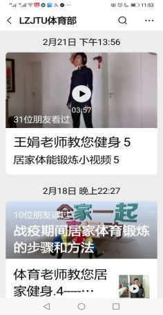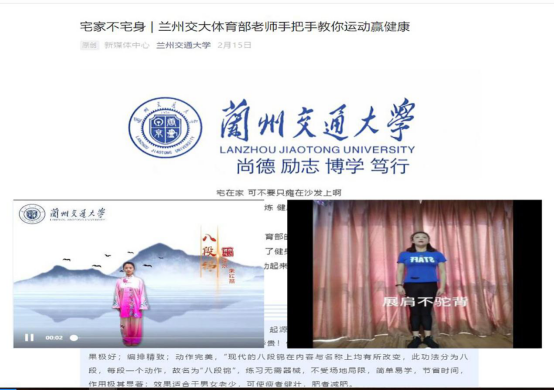 1.组织部分骨干教师成立战役教学团队,利用休息时间编出实用科学的健身技法和锻炼中的注意事项等文字和影音视频资料12部。帮助广大师生在家中科学健身,丰富居家生活,提高机体抗病能力。分别在兰州交通大学微信公众号、兰州交通大学体育部网站及LZJTU体育部微信公众号等多渠道地推出了系列居家健身方法,点击量达500多次。