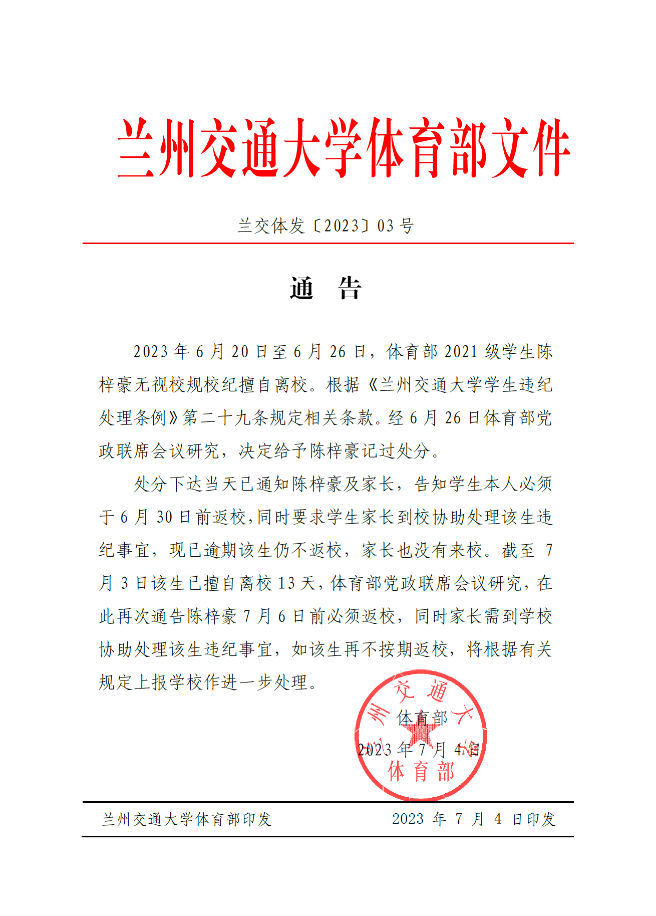 关于对体育部学生陈梓豪给予纪律处分的通告