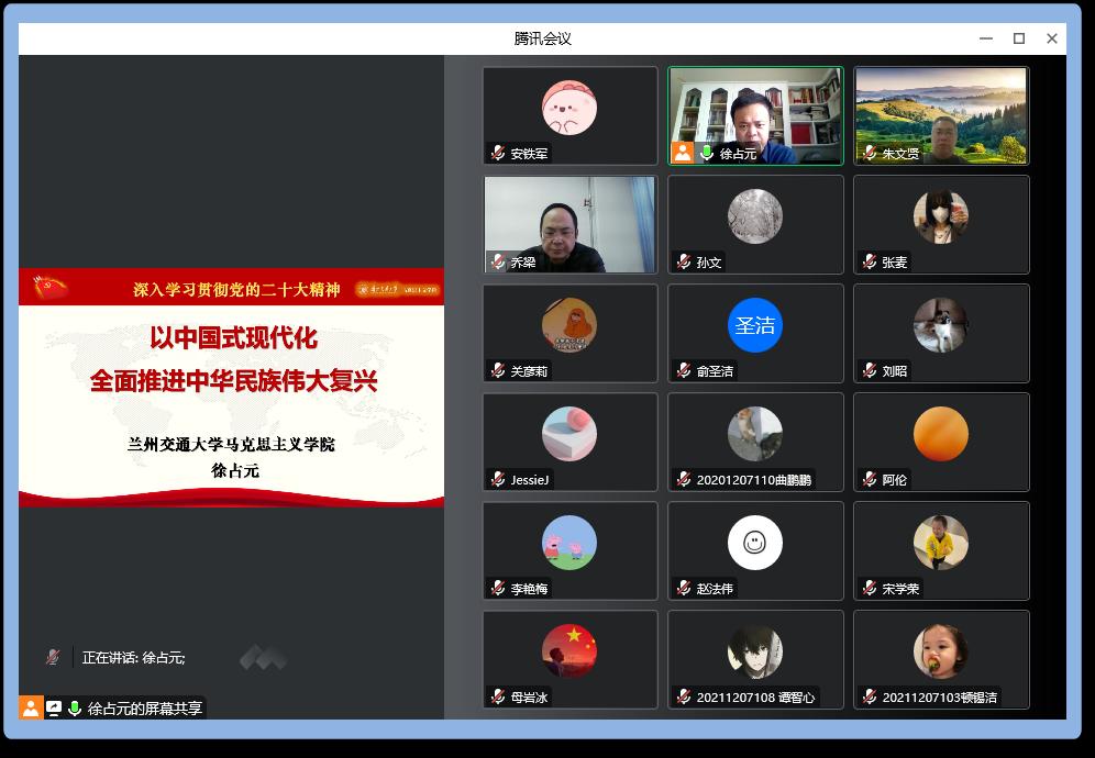 按照校党委《2022年兰州交通大学理论宣讲工作方案》统一部署,体育部“学习贯彻党的二十大精神宣讲会”于12月4日上午九时以腾讯会议在线视频方式进行,邀请兰州交通大学党的二十大精神专家学者宣讲团成员徐占元老师宣讲,会议由体育部党总支负责人主持,体育部全体师生参加宣讲会。